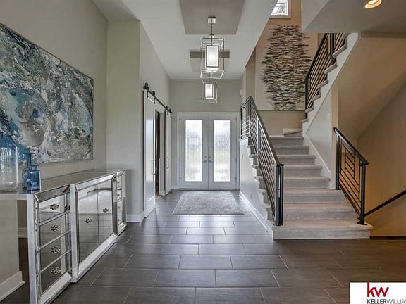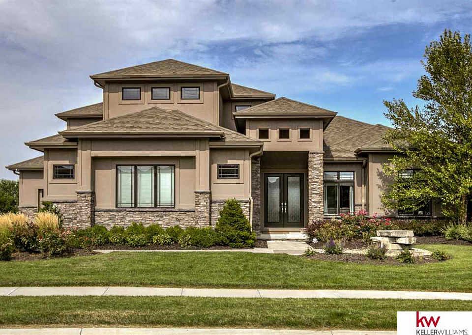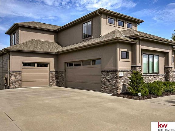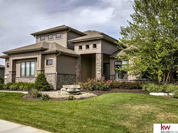Fabulous Street of Dreams 1.5 story in popular Windgate Ranch! This executive home features a unique open plan with specialty designer finishes throughout and a private beautifully landscaped yard that backs to trees. Interior features include an open gourmet kitchen with walk-through pantry, soaring ceilings on the main level, oversized master suite with luxurious bath, and XL two-story walk-in closet. The finished walkout lower level has a large wet bar for entertaining, sunken theater seating and exercise room with sauna. Enjoy outdoor living at it's best with an expansive covered composite deck, outdoor kitchen, and gas firepit with surround seating. This stunning home is in the desirable Elkhorn South school district, and is conveniently located near popular shopping, dining, and recreation.