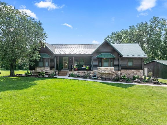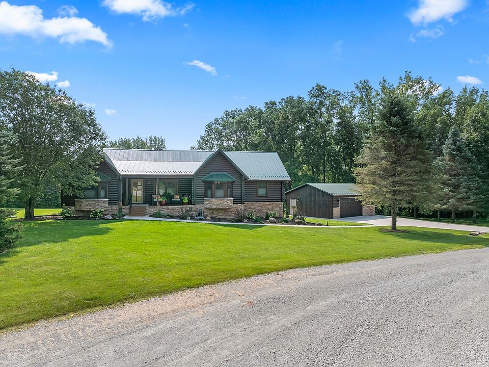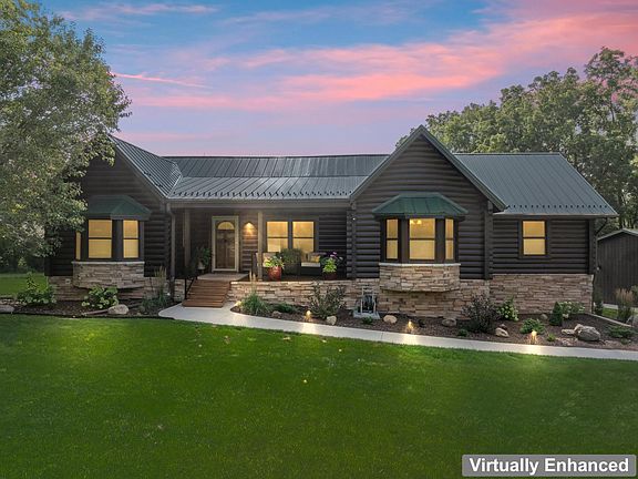 This is it! Your peaceful, little heavenly get away. Tucked away on a beautifully landscaped 1.2-acre lot, this impressive custom-built log home offers the perfect blend of rustic charm and modern comfort. Located on a quiet cul-de-sac this property is just 20 minutes from Rochester and offers school options in both Triton and Kasson-Mantorville districts. Inside, you’ll be greeted by soaring vaulted ceilings, dramatic exposed beams, cedar-paneled walls, hardwood floors, and sun-filled skylights that bathe the space in natural light. The open living room features a stunning floor-to-ceiling stone gas fireplace, pine ceilings and flooring, and walks out to a spacious 19 x 30 deck—ideal for entertaining or simply enjoying the peaceful surroundings. With 3,500 sq ft of finished space, this home offers a thoughtfully designed layout with a main floor primary bedroom retreat and private bath, main floor laundry with built-in cabinetry and deck access, and a fully finished lower level with a custom bar for hanging out with family and friends.