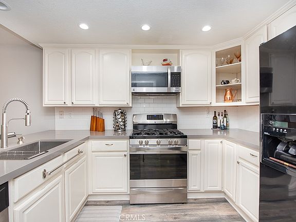 The main level features thick laminate wood-style flooring and a cozy wood-burning fireplace with gas starter and a private deck. The kitchen offers quartz counters, upgraded tile finishes, and stainless appliances, with a washer/dryer included. Bathrooms have all been thoughtfully modernized, from the powder room downstairs to the upstairs retreats with porcelain counters and all with stylish floor tile.