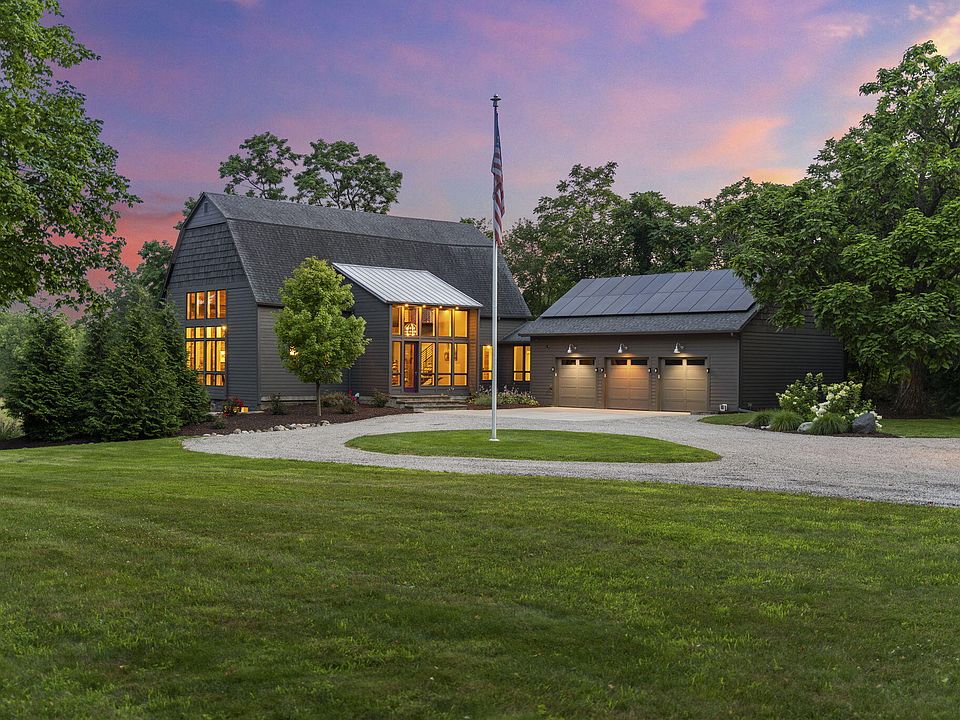 Surround yourself in privacy, peace & luxury in this elegantly designed & landscaped contemporary farmhouse on +3.2 acres nestled down a serene private driveway. Enjoy seamless indoor/outdoor living w/back & side decks for soaking in the picturesque surroundings. Light-filled floor-to-ceiling windows frame expansive views. Energy efficient open layout features impeccable materials & combination of textures, finishes, & architectural mastery. Superior insulation & heated floors throughout make the house cozy in winter. Gourmet kitchen w/custom-built cabinetry, sleek SS counters, top-of-the-line appliances & large SS island seamlessly connects w/dining room & great room. Gas fireplace flanked by French doors embrace the oversized deck, lending a retreat-like environment. Sizeable primary suite includes private deck, tiled luxury bathroom w/custom walk-in closet. Powder room & laundry/mudroom w/custom storage conveniently located off garage. Floating stairs lead to ensuite w/2 closets & tiled bathroom. Fully finished WOLL w/heated hickory floors & custom ceilings is perfect for family living and/or entertaining; includes 3 bedrooms, 2 ensuite bathrooms, family room w/kitchenette & range w/access to stone courtyard patio w/firepit. Oversized 3-car heated garage w/finished floors, EV charger, custom closets, storage, solar panels, & full house generator. Huge outbuilding for outdoor storage. Close to the DTE&B2B trails. Short commute to Ann Arbor!