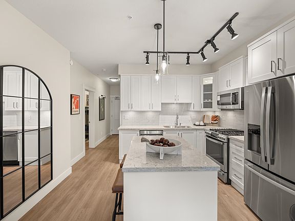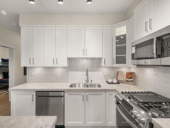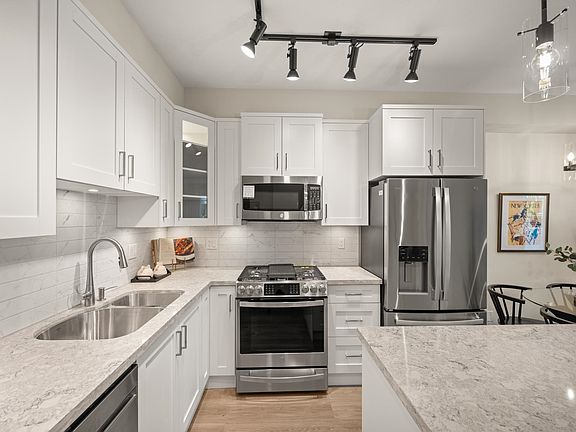 Top floorGourmet kitchenGe stainless steel appliancesQuartz countertopsWhite shaker cabinetsHeated tile bathroom floorsOversized windows