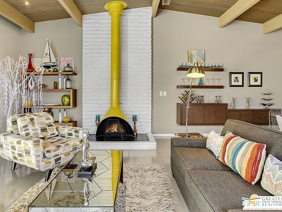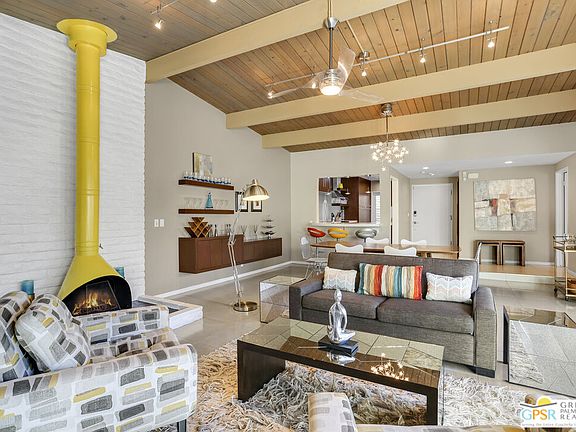 MAJOR PRICE REDUCTION. Located in South Palm Springs on fee-simple land (YOU OWN THE LAND) sits this beautifully remodeled and updated mid-century modern condominium with almost 1700 square feet of living space. Palo Fierro Estates is the hidden gem of South Palm Springs, with 34 units spread across just under 4 acres. The community includes two pools and a spa and has low HOA fees. Built in 1966, this mid-century stunner features 3 bedrooms and 2 baths, an open great room with a free-standing fireplace, breakfast bar, an updated kitchen, plus a spacious enclosed patio. The large primary bedroom has an en suite bath and a large walk-in closet and features double doors out to the enclosed patio which give it a bright, airy feel. The remodeled en suite bath features a double vanity and a large glass shower. The two guest bedrooms share another remodeled bathroom with a double vanity and shower-tub combo. The totally private enclosed patio has outdoor dining, a BBQ, and seating space. This unit is being SOLD TURNKEY, including furniture, linens, dishes, and decor (per inventory). The home is walking distance to many South Palm Canyon hotels, restaurants, and shops (including Koffi and the Ace), and just a few minutes drive to the center of downtown. Ideal for those who want to be close to everything! Perfect for a full-time residence, second home, or rental property (30-night minimum). Just bring your toothbrush!
