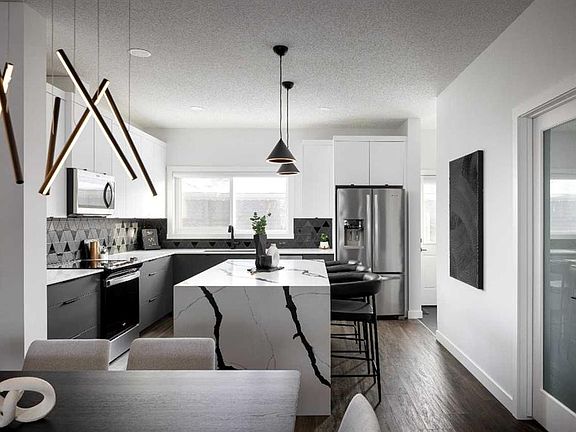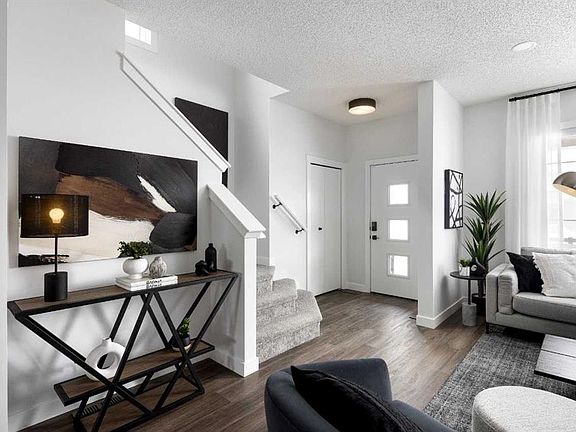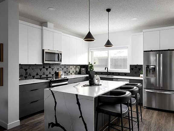 Welcome to the Cascade by Shane Homes, located in the vibrant community of Cornerstone. This brand new 3 bedroom, 2.5 bath home includes a spacious family room and thoughtful design throughout. The main floor offers 9' ceilings, luxury vinyl plank flooring, and a side entry with a 9' basement height that is perfect for future development. The modern kitchen features stone countertops, 42" upper cabinets with a bulkhead, a chimney hood fan, built-in microwave, and all appliances included. Bathrooms on the second floor feature tile flooring, and knockdown ceilings add a stylish touch throughout. Gravel parking pad included. Photos are of the Cascade showhome for representation purposes only. Move in tentatively scheduled for Spring 2026.