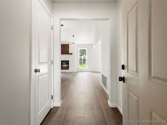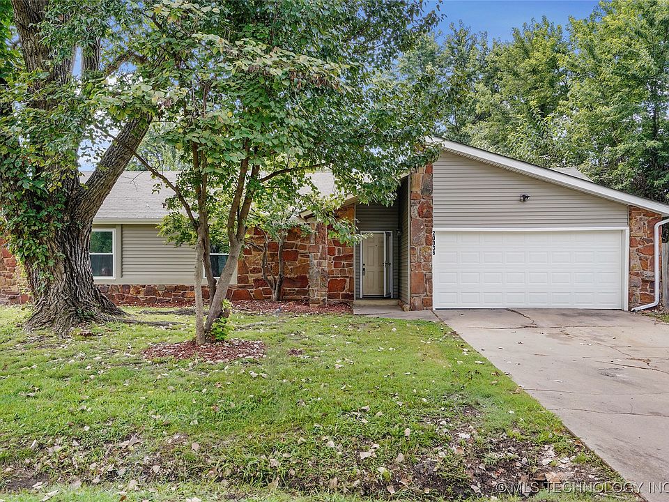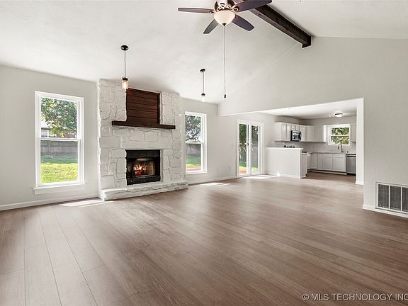 Beautifully Updated Home in Broken Arrow School District! This stunning property offers the perfect blend of charm and modern updates. Set on a spacious lot with full privacy fencing, it features eye-catching stone and vinyl siding and a welcoming covered entry. Step inside to a vaulted-beam great room with brand-new vinyl flooring and a cozy stone fireplace, ideal for chilly evenings.