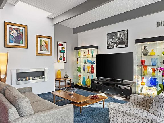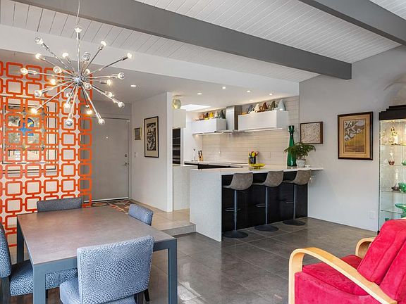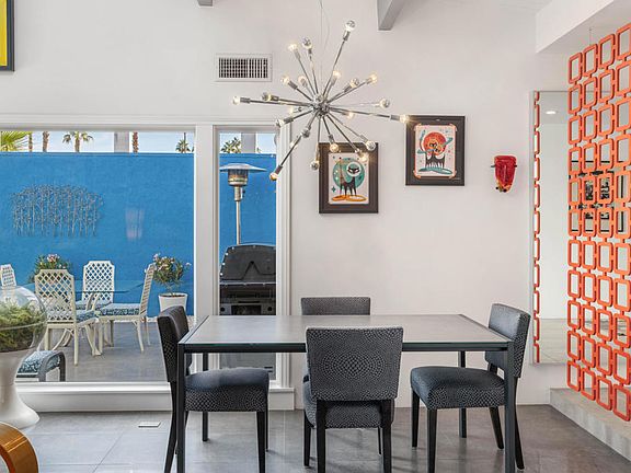 Nestled in the prestigious Palo Fierro Estates of South Palm Springs, this stunning Mid-Century Modern home is situated on fee land, meaning you own the land, a true rarity in the area. Boasting three spacious bedrooms and two luxurious bathrooms, the residence has been thoughtfully upgraded throughout. Large porcelain tile flooring enhances the open-concept layout, which seamlessly connects the main living spaces. The kitchen is a chef's dream, featuring stainless-steel appliances, sleek quartz countertops, and a breakfast bar perfect for a morning bite or entertaining guests. The spa-like primary bathroom includes a soaking tub, a walk-in shower, and dual sinks, creating a tranquil retreat. The great room, with its high ceilings, exposed beams, and striking glass wall, brings the beauty of the outdoors inside. Enjoy the private south-facing courtyard, complete with plenty of seating space and a BBQ area, perfect for entertaining or quiet relaxation. This home is equipped with fully paid for solar panels and and EV outlet, adding energy efficiency to its list of features. Located in an exceptional part of Southern Palm Springs, you're just minutes from vibrant downtown shops, restaurants, and nightlife. This is desert living at its finest.