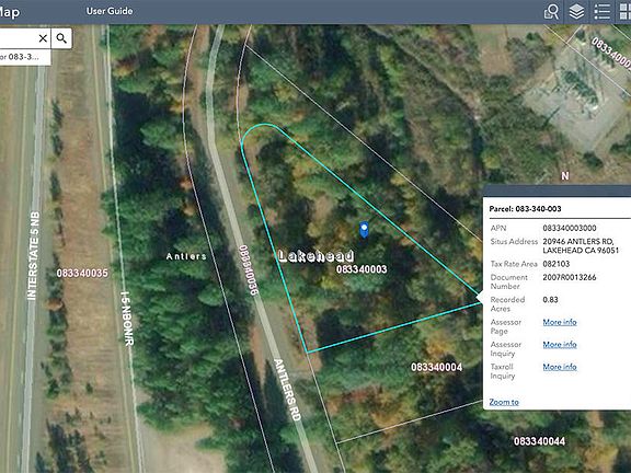 .83 acre lot with well & septic, right off I-5 and just down from Antlers Boat Ramp (on Shasta Lake). Zoned MIXED USE for residential... or how about a recreation-based business? In the heart of the Shasta National Recreation Area. Campgrounds, RV parks, gas stations, market, restaurants and ''watering holes'' nearby. See ''Documents'' tab for more property info.