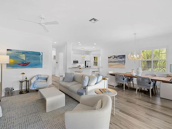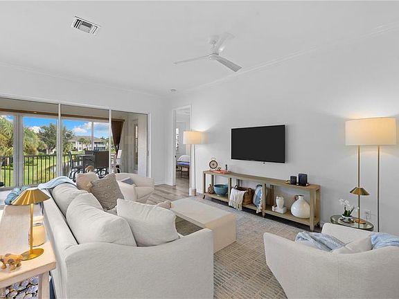 Inviting coach home featuring an open, spacious floor plan with 2 bedrooms plus a den and 2 full baths! Enjoy lake and fountain views from the oversized screened lanai—ideal for relaxing or entertaining. This well-designed residence features a large side yard with a park-like setting that provides an abundance of natural light throughout. Interior highlights include a beautiful kitchen with shaker-style cabinetry, granite countertops, a center island, stylish designer flooring and an open dining/living area that flows seamlessly together. Additional features include a two-car garage, beautiful tropical landscaping, and more. Marina Cove is perfectly situated directly across from the Windstar Marina and features a sparkling heated pool and spa with a private clubhouse and outstanding curb appeal! Windstar offers incredible amenities including: Tom Fazio designed golf course, newly redesigned clubhouse with spectacular views of Naples Bay, 72 slip deep-water marina with direct Gulf access in less than ten minutes, clay tennis courts, bocce ball, fitness, Keewaydin Island Beach Club with boat shuttle and private membership.