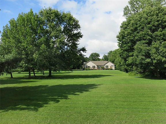 Move-in condition 3 bedroom Ranch home situated on park-like 7 acres with large shared stocked pond! Master Suite with walk-in closet and bathroom with stall shower & whirlpool tub. Eat-in cook's kitchen with all appliances. Family Room with cathedral ceiling, ceiling fan, custom built-in cabinets/shelves, sliding glass door to deck and gas fireplace. Living Room and Dining Area with cathedral ceiling with ceiling fan. Hardwood floors. Private rear deck overlooking yard and facing the pond. Low-maintenance vinyl exterior. Attached 2 car garage. Blacktop driveway with parking area. Peaceful, natural setting, yet with city water and natural gas! Central A/C. Full basement with stairs from the garage- easy access for storage and hobbies. Canoe & paddle boat included. Ultra-convenient location affording easy commutes to Rochester, NYS Thruway and the beautiful Finger Lakes Region! Great combination of quality home, convenient location and fun lifestyle!!!
