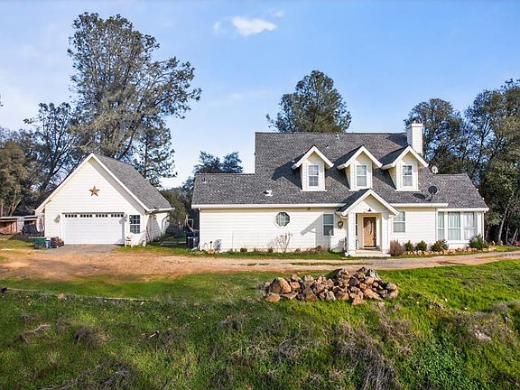 Custom built and thoughtfully designed, this 2,557 sqft home offers the perfect blend of privacy, comfort, in the hills of Grass Valley. Situated on a private 5-acre parcel with a natural slope, the setting provides peaceful surroundings and beautiful views without the burden of maintaining large expanses of flat land. The home features a spacious layout with three bedrooms and the potential for a fourth, ideal for a home office, guest room, or bonus space. Inside, you'll find 9-foot ceilings, abundant natural light, and quality finishes throughout. The gourmet kitchen is well appointed with stainless steel appliances, granite countertops, and ample cabinetry, opening seamlessly to the main living areas for easy entertaining. The large primary suite offers a relaxing retreat, complete with jetted tub and generous space. Additional bathrooms also feature jetted tubs and granite finishes. A tankless water heater adds efficiency and modern convenience. Step outside to the covered back porch and take in the surrounding views and quiet setting. The exterior is complemented by a large detached two-car garage with the potential for a storage room above, perfect for hobbies, equipment, or future expansion. A rare opportunity to enjoy a custom home, privacy, and scenic beauty.