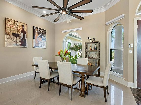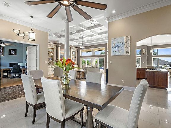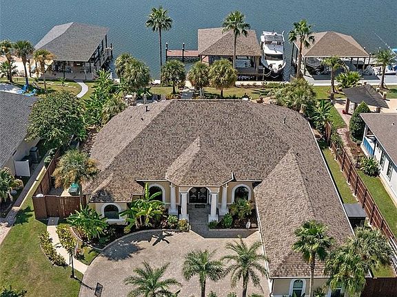 Lakeshore Estates home is a MUST-SEE PARADISE with over 30 palm trees! The open floor plan has 4 bedrooms, 4 baths with plenty of room to entertain. Beautiful coffered ceilings in living room. Primary suite on one side of the house with second bedroom and bath off the den. The third and fourth bedrooms have a shared bath, and the pool bathroom has direct patio access with a large walk-in shower. BRING YOUR BIG BOAT! Boathouse has SHORE POWER plus a boat lift with a 6000 lb capacity. Fishermen will love fishing, crabbing and shrimping right off the dock. Features include: New Boathouse (2021) with 1200-square feet of covered decking, new boat lift (2021) with 6000 lb. capacity, Bulkhead (2021) with extensive cement walkway, all new pool equipment for your heated salt water pool and spa, two water heaters, new gutters (2022), WHOLE HOUSE GENERATOR (2021), fully fenced yard with 8-foot privacy fence (2021), NEW ROOF (2020) and wind mitigation credit for homeowners insurance. The entire home has NEW WINDOWS (2022) with transferred warranty and maintenance plan, Dual AC Units (new 2020), roll-down HURRICANE SHUTTERS for all exterior doors, two sheds (2022) convey, new REMOTE controlled house blinds (2022), NEW LVP Flooring (2024) with extra flooring onsite for second bedroom and bathroom. All NEW interior light fixtures and fans (2021). New Dishwasher (2024), New Microwave (2025), New Refrigerator (2021). DUAL Ovens with warming drawer. GAS stove and fireplace. Lakeshore Estates Community is a gated community with 24-hour security guards. You don't want to miss everything this home has to offer at this amazing price point!