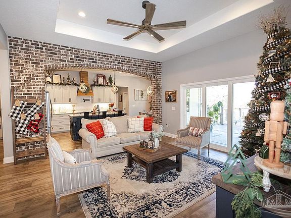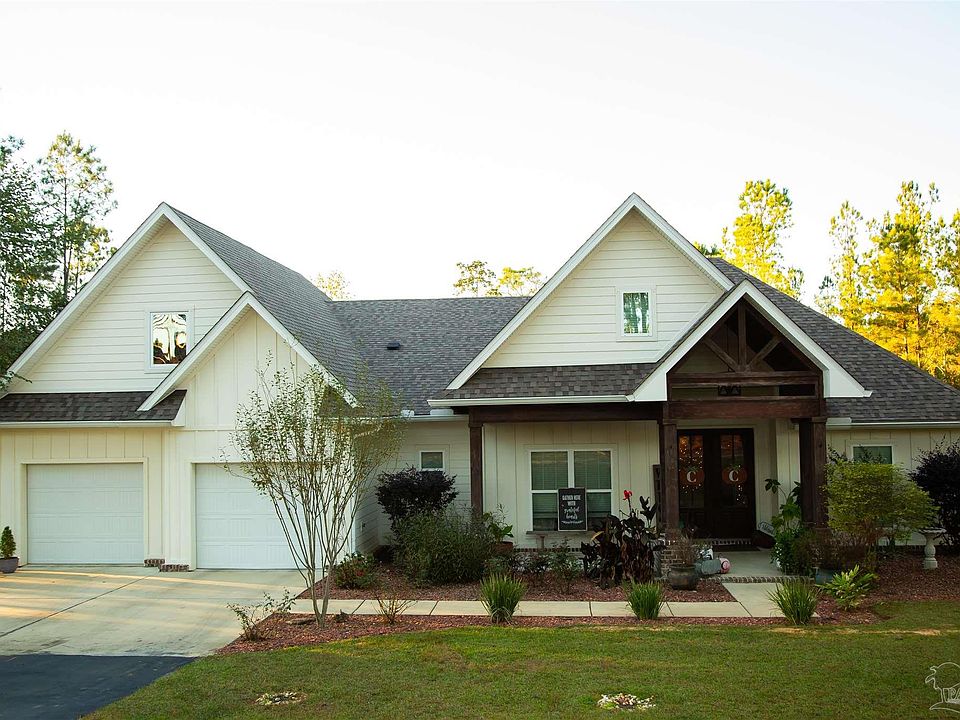 Secluded and private custom built home on 5 acres has everything you’ve been looking for! This 4bedroom/2bath home located on 5 beautifully wooded acres is waiting for a new family to call it home. You will be wowed as soon as you walk in the foyer offering an open floorplan from dining room, living area & kitchen! The kitchen boasts a custom Bricked archway, custom cabinets by West Florida Cabinets w two tone cabinets and under cabinet lighting, granite countertops, an accent wood vent hood, tiled backsplash and a large walk in pantry with wet bar nook. Master wing of home is tucked away, with a large walk in closet attached to the laundry room for easy access, spacious master bath w soaker tub, walk in tiled shower & his and her sinks. Split floorplan w 2 bedrooms on opposite side of home & large full bath w double sinks. There is also a 19’8 x 14’4 bonus room/office/additional bedroom upstairs w closet! You’ll arrive via paved driveway off Ten Mile Rd w 2 Car Garage & additional parking nooks off driveway. There is a gorgeous view off the back deck & natural spring at bottom of parcel allowing endless opportunities w this property! Additional upgrades include: gutters, sprinkler system, well water, shiplap accents, wood looking tile, under cabinet lighting, fiber internet, spray foam insulation, cameras and more! Do not miss out on this rare listing located in the heart of Pace, Fl!