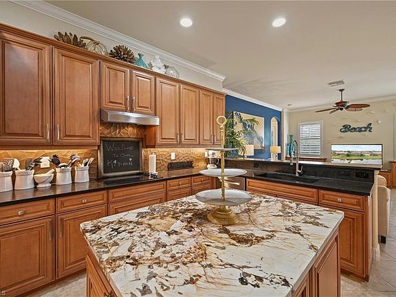 Long lake viewsTraditional floorplanLarge island-style layoutGranite countertopsCustom built-in cabinetryLarge screened-in lanaiSpacious family room