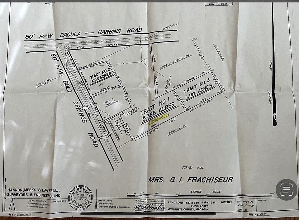 Corner parcel, located at Bold Springs and Harbins Road. Well traveled corridor in a developing area of Gwinnett county. This 5.3 acre tract has desired frontage and location as a potential commercial corner. Uses might include a convenience store, self storage, or multi-use possibilities.
