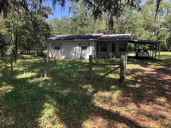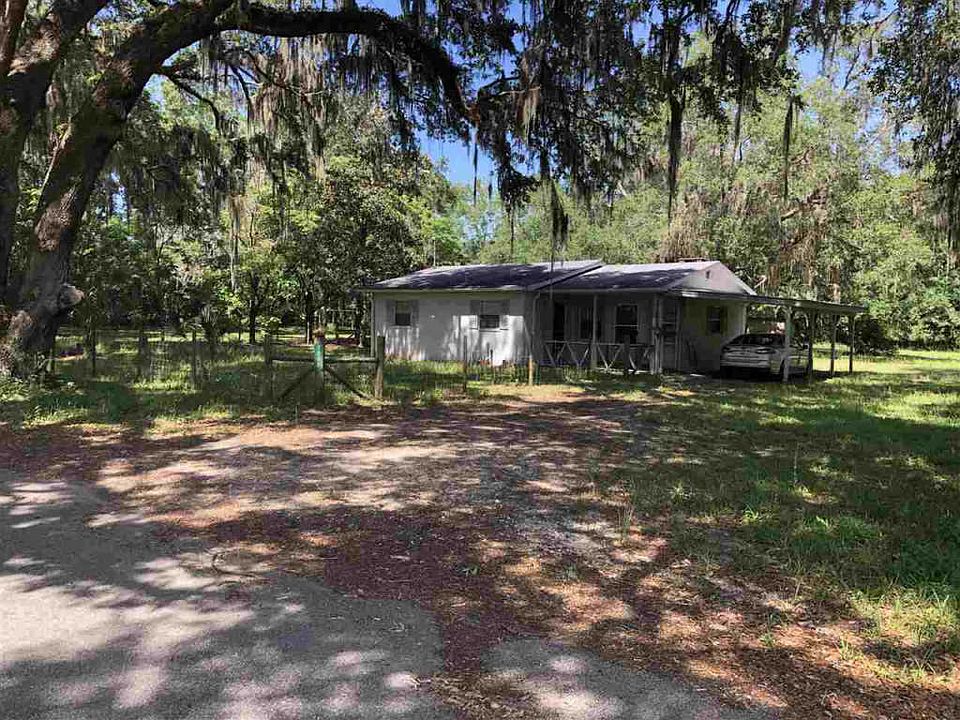 Why rent when you can own your own home for the price of rent? Come see this property while it lasts. This home sits nestled under beautiful oak trees on a 1.0 acre. Upon entering the driveway from the paved street, you see a fenced area for the front sitting porch and a one-car carport. This home is perfect for a starter home, new couple, or small family. Entering the front door, you immediately step into the living room family gathering area. The room has several windows for natural lighting and a brick fireplace flanked by windows. Moving into the eat-in kitchen you see brand appliances and ample cabinetry. Across from the kitchen is a large pantry/laundry/utility combination room with a closet. A small hallway opens into the full bathroom. The 2 bedrooms with closets split off to the right and left from this hallway. There is a hall closet for towels/linens/other. The back yard has two sheds for extra storage/lawn equipment. This home is country living at its best yet conveniently located to town.