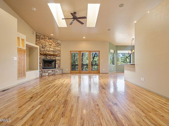 Huge price adjustment! Tired of the Phoenix heat? Nestled in Ponderosa Pines and pinion, you'll find a beautiful Prescott home, with great room and soaring ceilings, hardwood flooring and stone fireplace are beckoning you into the knotty pine and granite kitchen and dining area. The upper rear deck is available for breakfast or coffee anytime. You'll feel like you are in the treetops. A den/library/study is inside double doors and could be a 4th bedroom, complete with a closet. Gorgeous primary bedroom suite with door to the outside decking. Primary bedroom bath garden jetted tub awaits. Double sinks. Also on main floor is laundry and half-bath. Lower level has two bedrooms, bath and huge game /billiards/hobby or family room plus a living area with sliders to patio.