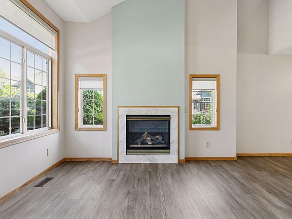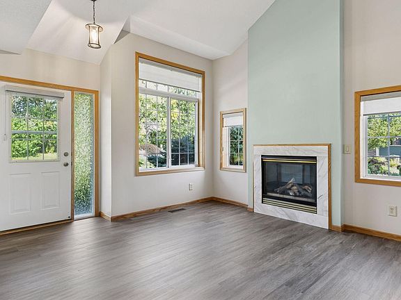 From the moment you enter, you're greeted by soaring vaulted ceilings and an abundance of natural light streaming through ample windows, creating a bright and airy atmosphere throughout the main living space. The gas fireplace anchors the living room, offering cozy warmth and a perfect spot to unwind while enjoying serene views of nature just beyond your windows.