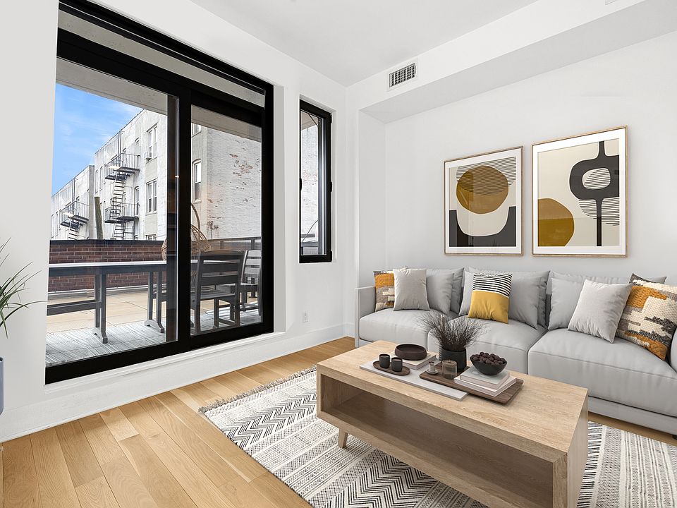 Experience contemporary city living in this bright one-bedroom condominium featuring a private terrace of approximately 430 square feet with southern exposure that fills the home with natural light. The terrace offers ample space that can be enjoyed for outdoor dining, entertaining, or quiet relaxation.