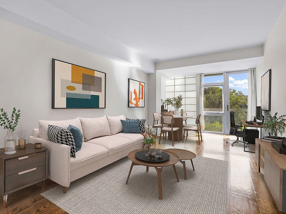 Apartment 3E is a bright and spacious condo accompanied by a private terrace with floor-to-ceiling windows, bathing the space in natural light with a portal view of Manhattan. It boasts a generous open layout, plentiful closet space and a modern kitchen with waterfall, Caesarstone countertops and a separate in-unit laundry room. In the bedroom there is a large, walk-in closet with customized Elfa shelving. The unit offers enough space to accommodate an office space either in the main room, bedroom, or convert the spacious walk-in closet to your private, home office. The unit includes video intercom, key fob entry and a variety of additional amenities. A private storage unit is included and there is an indoor parking space available for purchase. The apartment has been extremely well maintained and is in pristine condition.
