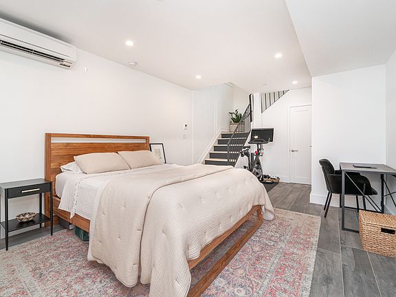 The lower floor is a very liberal 1 bedroom with a half bath, stackable washer and dryer, custom built wall unit closet, and an additional storage room. The downstairs space easily allows for ample bedroom furniture, as well as, a separate work from home space. Each floor has built in split unit heating and cooling systems. Both bathrooms are appointed with Grohe faucets and Kohler sinks and toilets.