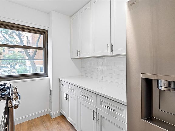The apartment features a fully renovated kitchen, complete with new cabinetry, quartz countertops, stainless steel appliances, and a tiled backsplash. Throughout the residence, one will find hardwood parquet floors, numerous spacious closets, including a walk-in closet in the foyer, and a highly desirable layout. Abundant natural light permeates the living room, owing to a panoramic wall of windows.