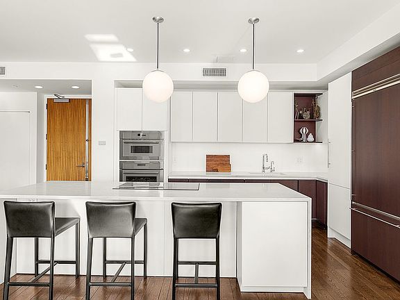 It’s not often that a spacious 3 bedroom apartment becomes available at 21 Astor Place making it a unique opportunity for anyone seeking the perfect blend of modern comfort and classic charm. The living and dining area is expansive and welcoming with richly stained oak floors and a wall of oversized windows that makes the space feel bright and airy. A gas fireplace adds a cozy touch, making it the perfect spot to relax during cooler evenings. The open chef’s kitchen is equipped with top-of-the-line appliances including a Viking refrigerator and Bosch oven, cooktop, and dishwasher. Whether you’re cooking for family or entertaining guests this kitchen is designed to impress.