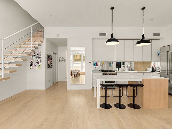 The home is meticulously renovated, preserving key elements like exposed brick walls and an incredible, majestic palladium arched window that adds timeless elegance to the space. A premium sound system has been thoughtfully installed throughout, enhancing the ambiance of every room. Additional modern amenities include a Miele washer and dryer, central zoned AC, and custom recessed lighting.