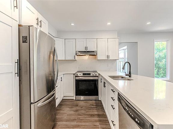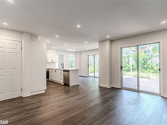FIVE-BEDROOM FAMILY HOME WITH MODERN UPGRADES, EFFORTLESS STYLE, & OVER 3,000 SQ FT OF LIVING SPACE - THE NEXT CHAPTER BEGINS HERE! Nestled on a quiet street in the established Allandale neighbourhood, this impressive family home delivers space, style, and convenience just minutes from schools, parks, shopping, the GO Station, scenic trails and the stunning Kempenfelt Bay shoreline. This home shines with standout curb appeal, featuring a wide 3-tier interlock walkway, a covered double-door entry, and tidy landscaping. The oversized driveway offers parking for four with no sidewalk to shovel, while the attached double garage boasts insulated black doors and soaring ceilings. Inside, you'll find a bright, open-concept layout with modern pot lights, flat ceilings with updated trim, rich engineered hardwood floors, and seamless flow between generously sized living areas. Enjoy cozy evenings in the stylish family room with a statement gas fireplace, and entertain in the expansive living and dining room framed by front and rear bay windows. The renovated eat-in kitchen dazzles with white cabinetry, quartz counters and backsplash, stainless steel appliances, a glass-top stove and a sliding glass walkout to the deck, perfect for effortless al fresco dining. The main level also offers a refreshed powder room, a spacious laundry room with direct garage access, and ample storage. Upstairs features four bedrooms, including a generous primary suite with bay windows, a walk-in closet, and a sleek ensuite with a tiled shower and floors, double vanity with granite counters. The finished basement adds even more living space with an additional bedroom including a 3-piece bath and flexible rooms perfect for work, play, or guests. Enhanced with Carrera marble-style tile at the entry and several newer windows for added peace of mind, this move-in-ready #HomeToStay is packed with upgrades and waiting to impress!