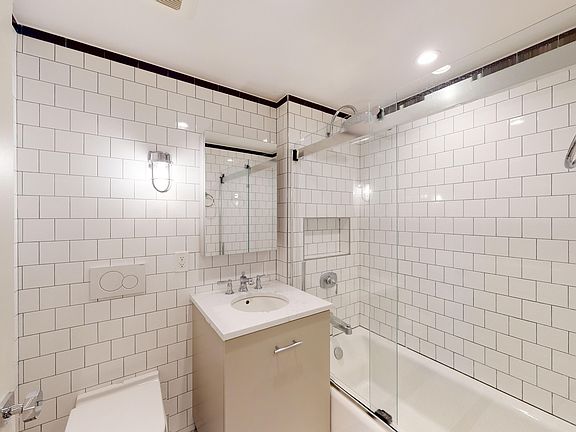 -One full bathroom with modern wrap-around tile, floating vanity, toilet, full tubs and shower.