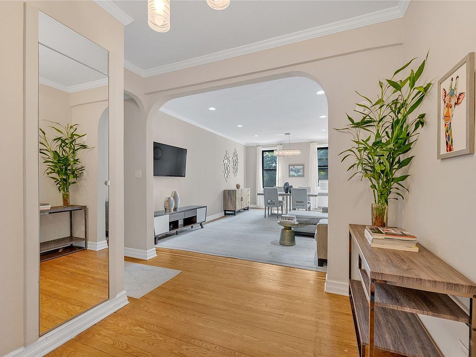 Welcome to this quintessential RENOVATED PARK-VIEW 2 BR/1 BTH expansive CO-OP residence located in THE WINDSOR, the most stunning luxury pre-war gem of Great Neck Plaza. This sophisticated unit boasts with charming details, including soaring ceiling heights, archways, hardwood floors & over-sized windows. Upon entry, you are welcomed by a gracious arched foyer, leading into an expansive living & dining space with amazing building gardens, park & breathtaking sunset views, a perfect setting to live, dine, relax or entertain. The unit features elegantly renovated Kitchen & Bath, recessed lighting & ample storage. The expansive floor plan of the apartment offers flexibility for a variety of furniture layouts. The WINDSOR offers beautiful landscaping, recently restored grandiose lobby, hallways & grand entrances, new elevators, modern intercom system, bike & individual storage in the basement & a live-in super. State of the art amenities include most elegant laundry room, resident lounge area with WIFI & TV, & cutting-edge Fitness Studio with high tech equipment which invites all to embrace wellness. Cats OK. LOVE WHERE YOU LIVE, a perfect balance between prewar elegance & first-class amenities!
