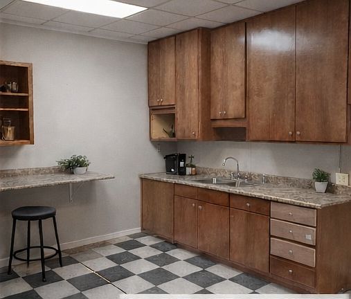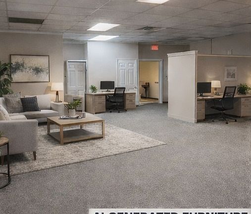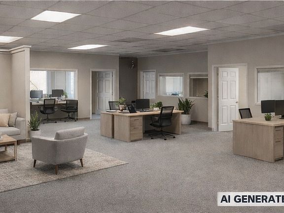 Well-lit commercial space with a flexible layout, featuring large windows, multiple private rooms, and an open central area. Includes built-in counters, cabinetry, and a kitchenette with sink. Neutral finishes and suspended ceilings allow for easy customization. Ideal for office, administrative, or light commercial use. Right off the interstate!