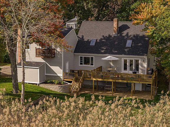 A rare find in Hampton- gorgeous, unobstructed water and marsh views of Meadow Pond. Every day is a vacation in this recently renovated and stylish 3 bedroom, 2 ½ bath Cape Cod-style post and beam home. The post and beams were whitewashed throughout to enhance the beachy, casual look. Enter the home through a spacious mudroom with coat closet, into the kitchen - a light and bright space with updated cabinetry, floors, appliances, and granite countertop. The kitchen opens to the dining room where a large picture window highlights the scenic vistas. The dining room and kitchen both open to the spacious front-to-back living area featuring a large brick hearth and gas fireplace. A 3-paneled French door opens onto the large 2-tiered deck overlooking the tidal pond and coastline. Also on the main level is a half bath with laundry room and access to the lower level. The second level offers two spacious bedrooms with generous closet space as well as a full bath. A separate staircase off the main level leads to the Primary Suite, offering a fully updated bath with air-jetted jacuzzi and soaking tub, walk-in closet, and a private balcony for enjoying morning coffee and a view of the sunrise. The separated space makes this master suite a private retreat. The finished lower level includes a large family room and bar area, and an additional room perfect for an office or guest space, plus unfinished storage space. Oversized 1-car garage with heat is a great place to store your toys.