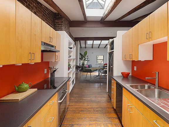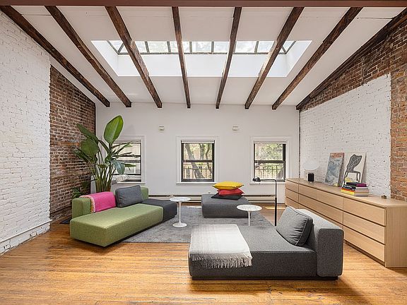 Enter two flights up, and you are greeted with a dramatic great room, beamed ceilings nearly 11" high, exposed brick walls, and a massive skylight that floods the space with natural light. Windows frame the tree lined beauty of Bleecker Street, giving your home that unmistakable downtown charm.