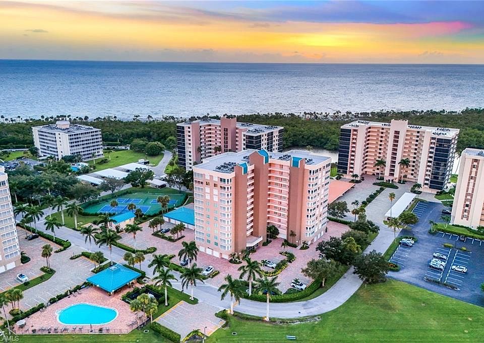 Welcome to your dream property in picturesque Naples, where luxury meets coastal serenity. This stunning 10th floor, 01 stack end unit offers elevated Gulf and Channel views from a wrap-around lanai, perfect for savoring breathtaking sunsets. The meticulously remodeled unit features over $250,000 in upgrades including a newly remodeled kitchen that features Bosch stainless steel appliances, quartz counters, and a porcelain tiled scalloped backsplash, ensuring a perfect blend of style and functionality. Professionally decorated with a coastal elegant feel, the residence comes fully furnished with designer furnishings, ready to provide an upscale living experience. Enjoy the tranquility of a guest suite that boasts a private balcony overlooking the bay and mangroves, where you can relax and watch the dolphins swim or boats coast by. The property ensures peace of mind with full hurricane protection, with a combination of impact glass windows and shutters. Immerse yourself in a vibrant community with amenities such as a pool, pickleball, and tennis courts. Positioned in a coveted North Naples location, you're within walking distance of Delnor Wiggins State Park and short distance to Vanderbilt Beach, with easy access to Mercado's shopping and dining delights. Experience the pinnacle of Florida's coastal living in this exquisite home.