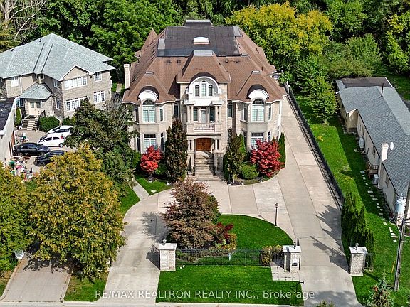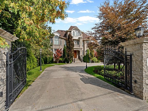 An architectural triumph in prestigious 'South Richvale', this estate commands attention from the moment you arrive. A gated circular drive with 4-car garage introduces the residence, while a stately stone portico entrance way with columns sets the tone for timeless refinement. A soaring 40-foot grand atrium foyer crowned by a cathedral skylight delivers an unforgettable first impression. Bathed in natural light, the space rises dramatically, framed by oak staircases w/ intricate iron spindles, wood paneling, wainscoting, crown molding, and polished marble and granite finishes every detail chosen to embody timeless elegance. The main level is both luxurious and functional. At its heart lies a gourmet chefs kitchen with cathedral breakfast area, oversized island, and top-tier stainless steel appliances, complemented by a full prep kitchen. Formal and casual living spaces flow seamlessly framed by 10 & 11 foot ceilings w/ built-in speakers, while a paneled natural wood office provides a refined workspace. Dual powder rooms enhance convenience and entertaining. The second and third levels host seven expansive bedrooms, each w/ ensuite, marble finishes, and walk-in closets, many opening onto private balconies. The master retreat indulgences with two heated en-suites, two custom walk-in closets including a marble dressing room, sitting area, and fireplace. The upper level also includes an apartment-style suite and a dedicated prayer room with private washroom. The lower level is designed for leisure and wellness. A home theatre and karaoke lounge with projector screens invite entertainment, while a wine cellar with heated floors and full kitchen enhance gatherings. A spa sanctuary features sauna, jacuzzi, heated floors, and multiple washrooms, complemented by a nanny suite and second laundry for multi-generational living. Steps from Yonge Street and minutes to Hwy 407, this estate unites architectural brilliance, modern comfort, and an unmatched sense of grandeur.