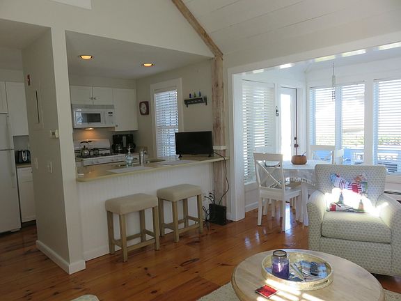 Enjoy your oceanside villa overlooking Nantucket Sound. Steps to your private Maushop Village beach and a short stroll to the Popponesset Marketplace with shops & restaurants. This Nantucket style one-level villa offers a back private brick patio with ocean breezes and views sitting on an elevated setting. Two storage sheds. Mini split heat/ac. Offered turn-key with quality furnishings. Kitchen w/ bar counter open to living room with cathedral ceiling and sun porch with cathedral ceiling for dining or extra sleeping area. Full bath, laundry closet and bedroom. Pine flooring. Check out membership at the New Seabury Club offering pools, beach club, athletic center, fine dining, tennis, fitness, pickleball and so much more. Annual Village charge $704.52