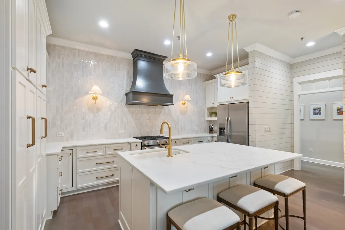 Crown moldingRenovated kitchenAdjoining breakfast areaCustom hooded ventRemote controlled custom shadesNew tile backsplashQuartz countertops