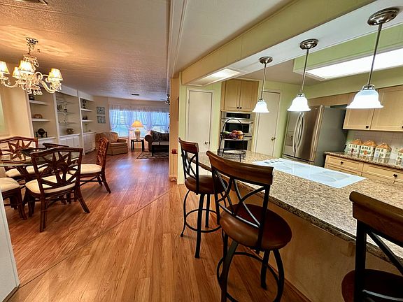 Live the Dream in King's Gate Club - A Premier 55+ Resort Community! Experience Florida living at its finest in this beautifully updated 2-bedroom, 2-bath manufactured home offering 1,619 sq. ft. of bright, open living space. Nestled on a large cul-de-sac lot on Cow Pen Slough, where kayaking for miles in this fresh water canal is at your back door. Inside, the remodeled open-concept kitchen is a chef's delight with an island cooktop, double ovens, dishwasher (2023), and refrigerator (2022). With two pantries, there's no shortage of storage. The inviting living and dining areas flow seamlessly, making entertaining a breeze. Retreat to your primary suite, remodeled in 2017, featuring a double vanity and a walk-in tiled shower with built-in bench and niches. The updated guest bath offers modern style and comfort. Relax year-round in the a/c lanai with acrylic windows mirrored on the outside for privacy, or entertain in the large, screened room with double doors. Enjoy peace of mind with new windows throughout (2018) and a vapor barrier for long-lasting efficiency. The wide driveway, (coasted in 2023), has a covered golf cart parking. Embrace the old world Florida charm in a tranquil private setting by a freshwater canal. Other Important Information: HOA fees are paid quarterly, $1315 and include water (we own water treatment plant), sewer (we own sewer treatment plant), lawn maintenance, and 200 channel Fiber Optics TV and Internet. Pet Restrictions: Two Indoor Cats. Service and Emotional Support Animals when they meet the ADA and Florida state laws. ESA's will have club authorized forms completed, reviewed, and approved prior to allowing animals on the property. Club Approval Required: Criminal and Financial background checks are required. A check payable to KGC for $250 must be submitted to management at least 30 days prior to closing before residents can be approved. Lease Restrictions: Criminal background check on ALL people residing in leased property. 1 Month minimum rental.