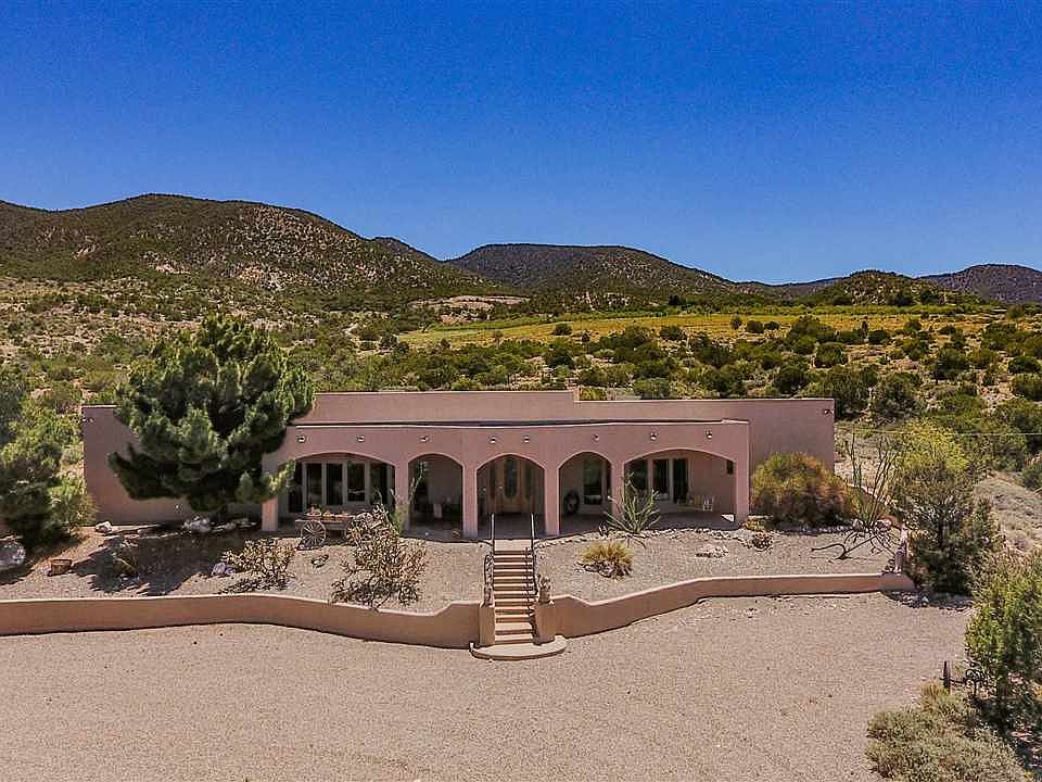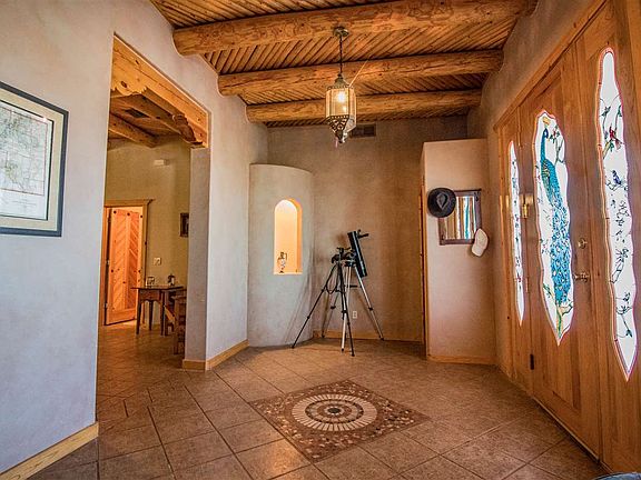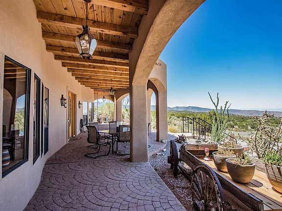 REMARKABLE 360° VIEWS including White Sands! This 3 BR, 2.5 BA, custom home with approx. 3332 sq. ft. w/35-acres has it all! Home is single level. The features are endless: 3 water sources, R/O system for the whole house, 3 kiva style F/Ps, unique architectural detail t/o, beamed herringbone wood ceilings, covered porch & patio, gazebo & fruit trees. Beautiful interior fountain as you enter. Custom stained-glass, mosaic tile & wrought-iron chandeliers add to the charm. Horses welcome. See virtual tour.