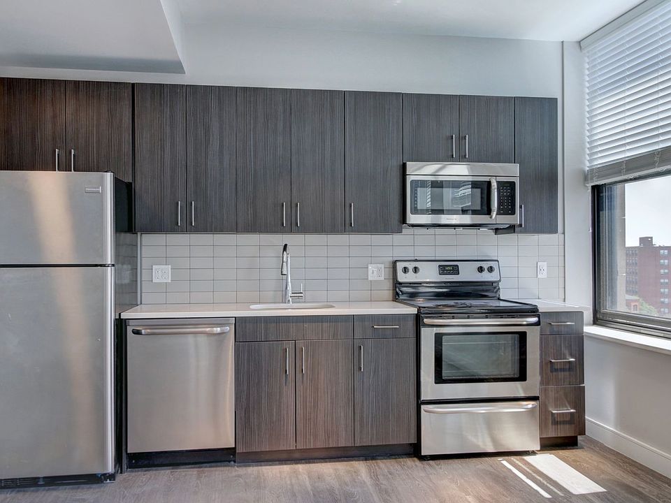 Unit 801 is a spacious studio has stainless steel appliances, custom cabinetry, granite countertops, energy efficient HVAC, and in-unit laundry.