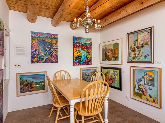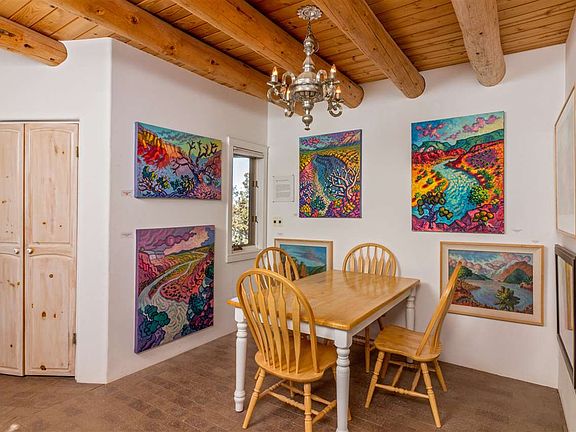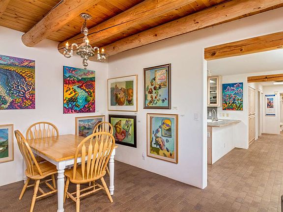 Custom home high on the hillside looking toward outstanding Sandia & Ortiz Mountain views. Lots of south facing windows gain passive solar winter heat and light. Open plan design allows lovely indoor/outdoor spacious feel to kitchen, dining and living room. Dramatic living room with corner kiva fireplace is a wow feature, the wonderful sunset Cerrillos Hills view will delight both owners and guests. Viga ceilings and brick floors add character and style. Two evaporative coolers were added for summer cool, new sto stucco in 2010, operable windows replaced and roof upgraded and maintained. This lovely EJ Jennings custom built home is surrounded by mature trees sits high on a knoll is a quiet central location of Eldorado with easy access to local shopping, schools, parks and Eldorado amenities.