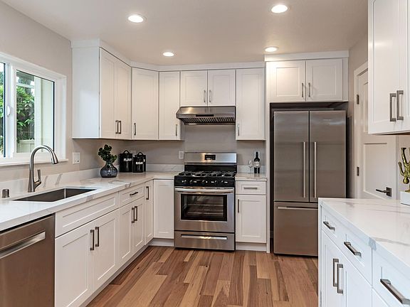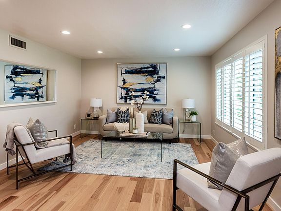 Newly remodeled townhome with large living room with hardwood floors, open kitchen with Shaker style cabinets, quartz countertop & stainless appliances. Separate dining area with sliding doors to the private patio. Separate laundry room with full size washer & dryer. Spacious primary bedroom suite with closet organizer, primary bath with mosaic marble floors & stacked tile shower surround. Generous size guest bedrooms with ample closet space. 4th bedroom with built-in workstation. Central heating and AC plus finished garage & carport. Convenient to shopping, downtown, schools & freeway access.