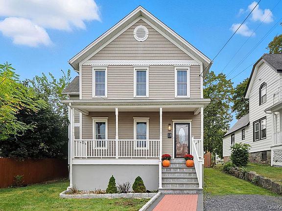 Welcome to 21 Cozzens Avenue, in the Village of Highland Falls. Just steps from quaint Main Street, West Point, and a short drive to Bear Mountain and Storm King, this charming home offers nearly 2,000 square feet of flexible living space—officially two bedrooms and two full baths, but lives more like a three-bedroom home. A brick walkway and bluestone steps lead to the welcoming front porch, with exterior siding featuring scalloped detail that enhances the home’s character. Inside, you’ll find a generous living room with French doors opening to the formal dining room. The kitchen offers a newer gas range and dishwasher, ample cabinetry, and access to the back porch—perfect for al fresco dining, overlooking the large, fenced-in, level yard.
