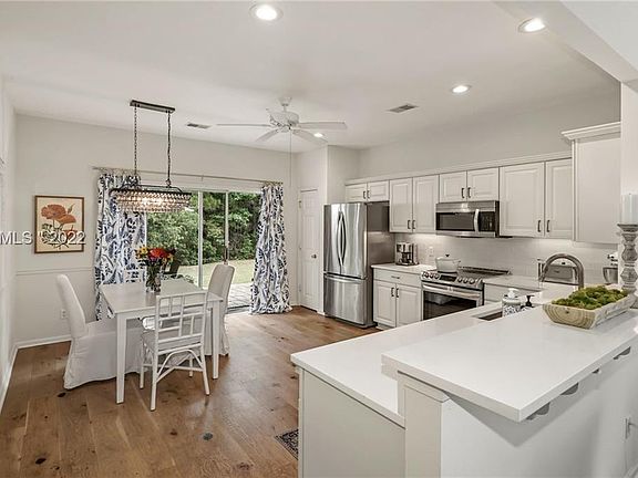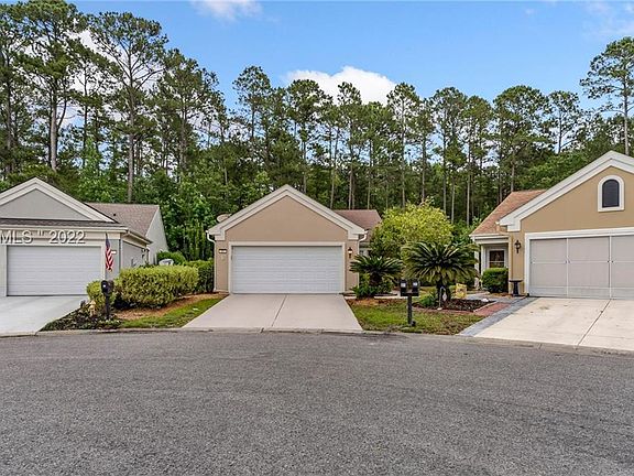 This is the popular Primrose floor plan that includes primary and guest bedrooms as well as a den. It rests on a large lot nestled on a peaceful cul-de-sac. In this model, the kitchen is in the rear and looks out over the wooded view of a conservation area. The kitchen was updated in 2022 with quartz countertops, tile backsplash, deep stainless sink. Stainless appliances. Updated lighting fixtures in the baths and kitchen, and the ceilings are smooth. The main living areas have engineered wood flooring, and the primary bedroom has new carpeting. The home features an extended garage with pull-down stairs to attic storage. New A/C in 2021.