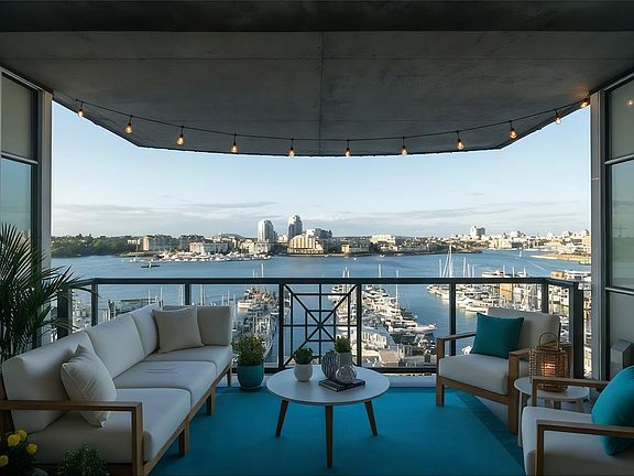 Waterfront addressTwo private balconiesFloor-to-ceiling windowsGourmet kitchenPremium appliancesSpa-like bathsCozy electric fireplace