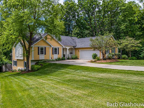 5 BR 3-1/2 bath Charming, Cottage style ranch, Forest Hills Schools, Ada Village within 2 miles! Located at the top of Deer Run Drive, enjoy this quiet, wooded, 1/2 acre property with lovely home. Breathtaking views from every room. Open Concept, Vaulted ceilings, hardwood floors, fabulous kitchen with new countertops, backsplash. Master BR with completely remodeled Master Bath. Walk in closet. 2 more BR, Full Bath and Main Floor laundry. Two tier deck perfect for entertaining. Walkout level features. 9' ceilings. Wall of windows/doors open to patio where you can enjoy a bonfire. 2 BR and full bath complete lower level. 50 year roof. Wired for whole house generator. If you are looking for a quiet setting with mature trees yet in a neighborhood and close to Ada Village, come see!