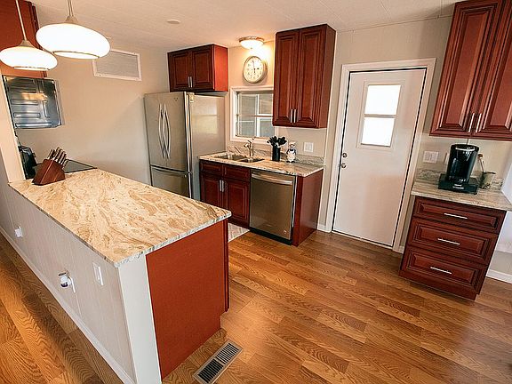 Meticulously up dated 2 bedroom, 2 bath homeboasts over 1300 SqFt of livingspace and 1056 under air, with Attached Carport and Attached Utility Room for storage and Washer & Dryer! You OWN the lot and HOA ONLY $45.00 PER MONTH! This is one of the nicest homes in Thunderbird Mobile Home Park! New kitchen with solid hardwood cabinets and granite countertops. Stainless steel appliances and a coffee bar! New flooring through out. Both bathrooms have been remodeled with fully tiled walk-in showers and solid wood cabinetry with granite counter tops. New ceiling fans through out the house and bedrooms. New water heater and outside AC condenser (2018). New curbing in the yard. 55+ Community, Very Active Community, Heated Pool, storage available for motor homes & boats. Great location, close to restaurants, beaches, shopping and more! One time transfer fee is $1000 & paid by the buyer at closing Call today for your private showing before this one is gone!