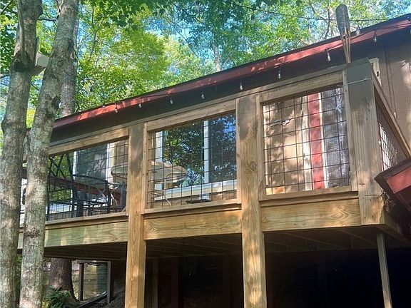 Dual drivewaysDeck with mountain viewsGolf cart garageLarge cabin windowsBedroom great for guests