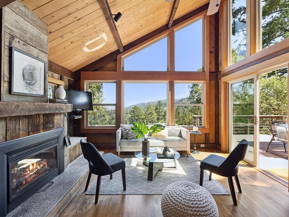 From a spectacular site on Inverness Ridge, a pristine two-story cabin takes in a mansion's view. A panorama unfolds endlessly from picture windows that frame Mt Tam, Bolinas Ridge, and the Olema Valley. Inside, a delightful wood and glass home provides a perfect getaway, party house, or fulltime country residence. A great room, warmed by a fireplace, opens to a two-level deck. Repurposed barn siding outlines the hearth; upgraded windows and doors pull the outside in. Oak floors run throughout this room and the bedroom wing. A spacious entry and living room include a view deck from outswing French doors. Downstairs a comfortable guest suite offers a bedroom, full bath and sitting room. Over an acre of privacy; steps from miles of park trails; and incredible star-lit nights.