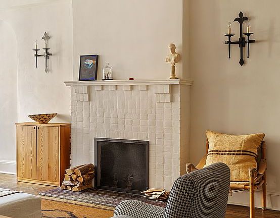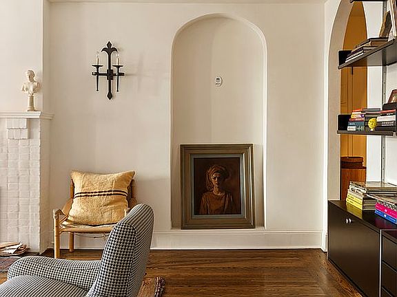 The centerpiece of the living space is a functional wood-burning fireplace, finished in square brick and covered in plaster German slurry. Two hollowed-out arches flank the fireplace and echo the cylindrical arched doorways throughout the the home; they currently serve as a warm backdrop for paintings. Venetian plaster walls prevail throughout the home, adding texture, preserving simplicity and imbuing the space with a peaceful, monastic sensibility.