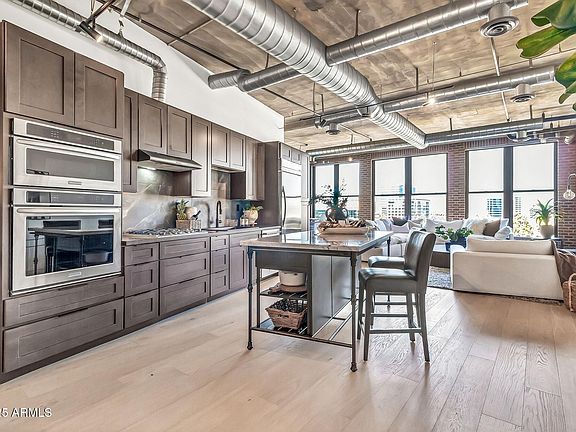 Discover sophisticated urban living at the iconic Orchidhouse Lofts. This fully remodeled 1-bedroom + loft captivates with soaring ceilings and floor-to-ceiling windows showcasing breathtaking views of ''A'' Mountain, Camelback, Papago, Tempe Town Lake, Tempe City Hall, and sparkling city lights. Set on the 6th floor, it blends modern luxury with authentic industrial charm—brick accents, concrete ceilings, wood floors, and exposed ductwork. The designer kitchen features a marble-topped island, stainless appliances, and custom cabinetry. Enjoy convenience with two secured underground parking spaces, elevator access, Live/Work zoning, and optional amenity use at a nearby hotel. Impeccably maintained with serviced HVAC, electrical upgrades, and the new high-end washer/dryer unit conveys.